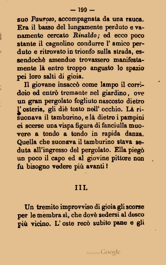 Il giovane insaccò come lampo il corridoio ed entrò tremante nel giardino, ove un gran pergolato fogliuto nascosto dietro y osteria, gli diè tosto nell' occhio. Là risuonava il tamburino, e là dietro i pampini ei scerse una vispa figura di fanciulla muovere a tondo a tondo in rapida danza. Quella che suonava il tamburino stava seduta all'ingresso del pergolato. Ella piegò un poco il capo ed al giovine pittore non fu bisogno vedere più avanti I