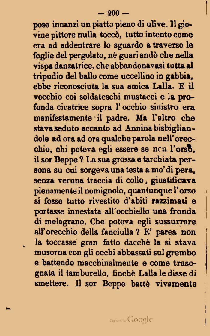 pose innanzi un piatto pieno di ulive. Il giovine pittore nulla toccò, tutto intento come era ad addentrare lo sguardo a traverso le foglie del pergolato, né guari andò che nella vispa danzatrice, che abbandonavasi tutta al tripudio del ballo come uccellino in gabbia, ebbe riconosciuta la sua amica Lalla. £ il vecchio coi soldateschi mustacci e ja profonda cicatrice sopra 1' occhio sinistro era manifestamente il padre. Ma l'altro che stava seduto accanto ad Annina bisbigliandole ad ora ad ora qualche parola nell'orecchio, chi poteva egli essere se ncu l'orsi, il sor Beppe ? La sua grossa e tarchiata persona su cui sorgeva una testa a mo'di pera, senza veruna traccia di collo, giustificava pienamente il nomignolo, quantunque l'orso si fosse tutto rivestito d'abiti razzimati e portasse innestata all'occhiello una fronda di melagrano. Che poteva egli sussurrare all'orecchio della fanciulla? E' parea non la toccasse gran fatto dacché la si stava musorna con gli occhi abbassati sul grembo e battendo macchinalmente e come trasognata il tamburello, finché Lalla le disse di smettere. Il sor Beppe battè vivamente