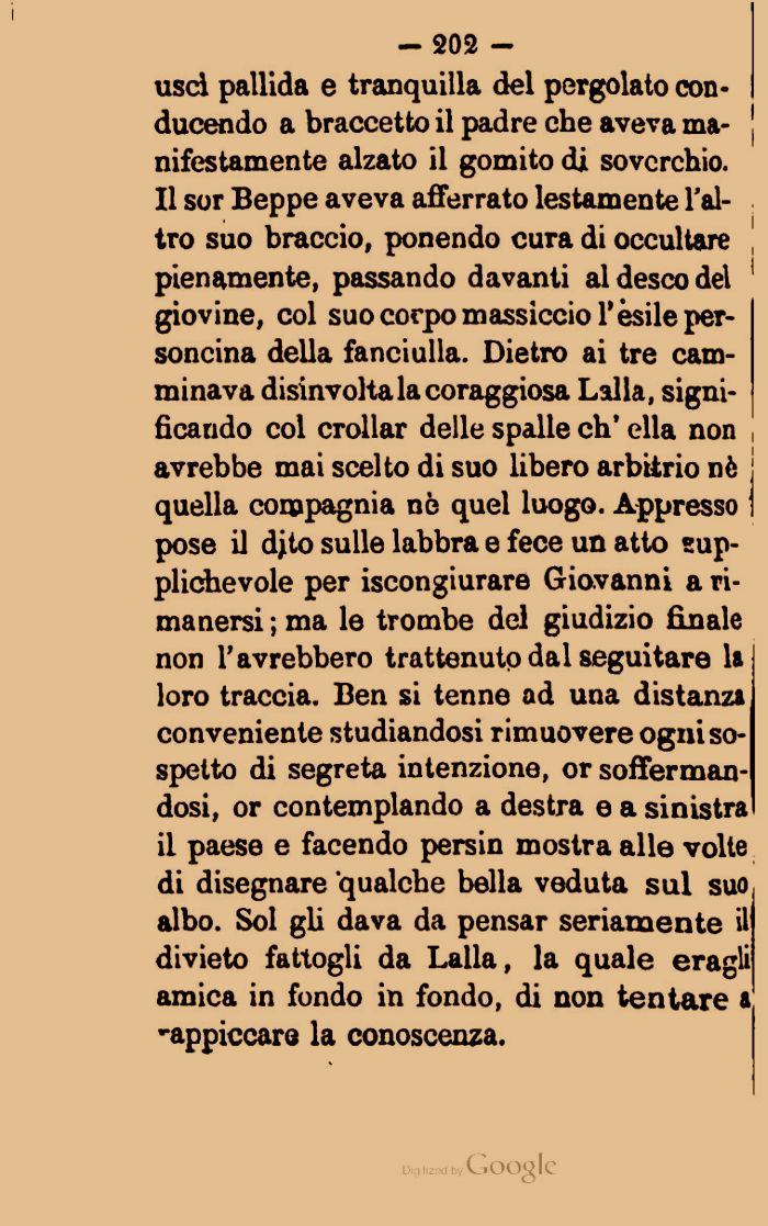 usci pallida e tranquilla del pergolato con-ducendo a braccetto il padre che aveva ma- ' nifestamente alzato il gomito di soverchio. Il sor Beppe aveva afferrato lestamente l'altro suo braccio, ponendo cura di occultare pienamente, passando davanti al desco del giovine, col suo corpo massiccio l'èsile personcina della fanciulla. Dietro ai tre camminava disinvolta la coraggiosa Lalla, significando col crollar delle spalle eh' ella non avrebbe mai scelto di suo libero arbitrio nè ; quella compagnia nè quel luogo. Appresso j pose il djto sulle labbra e fece un atto supplichevole per iscongiurare Giovanni a rimanersi ; ma le trombe del giudizio finale non l'avrebbero trattenuto dal seguitare li; loro traccia. Ben si tenne ad una distanzi conveniente studiandosi rimuovere ogni sospetto di segreta intenzione, or soffermandosi, or contemplando a destra e a sinistra il paese e facendo persin mostra alle volle di disegnare qualche bella veduta sul suo albo. Sol gli dava da pensar seriamente il divieto fattogli da Lalla, la quale eragli amica in fondo in fondo, di non tentare i 'appiccare la conoscenza.