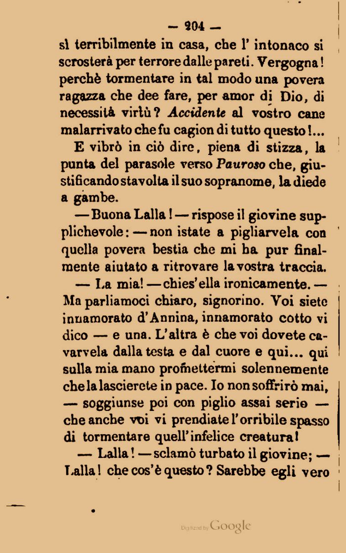 E vibrò in ciò dire, piena di stizza, la punta del parasole verso Pauroso che, giustificando stavolta il suo sopranome, la diede a gambe.