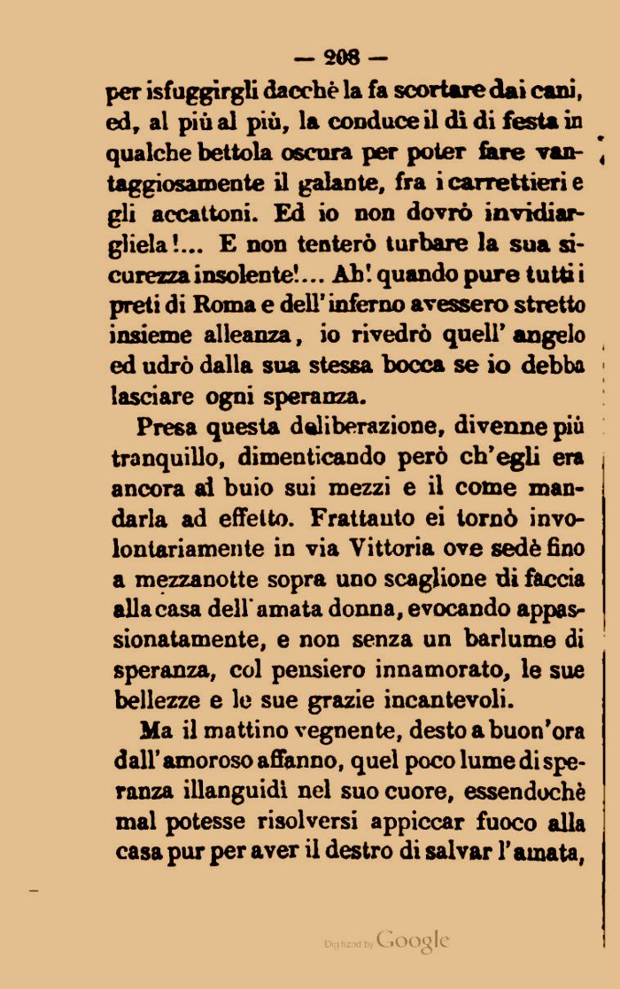 Presa questa deliberazione, divenne più tranquillo, dimenticando però ch'egli era ancora al buio sui mezzi e il cotne mandarla ad effetto. Frattanto ei tornò involontariamente in via Vittoria ove sedè fino a mezzanotte sopra uno scaglione di faccia alla casa dell' amata donna, evocando appassionatamente, e non senza un barlume di speranza, col pensiero innamorato, le sue bellezze e le sue grazie incantevoli.
