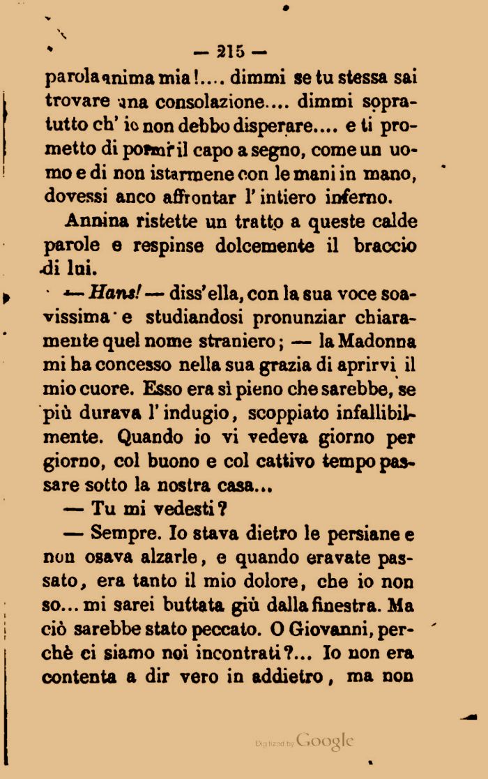 •— Hans! — diss' ella, con la sua voce soavissima e studiandosi pronunziar chiaramente quel nome straniero ; — la Madonna mi ha concesso nella sua grazia di aprirvi il mio cuore. Esso era si pieno che sarebbe, se più durava l'indugio, scoppiato infallibilmente. Quando io vi vedeva giorno per giorno, col buono e col cattivo tempo passare sotto la nostra casa...