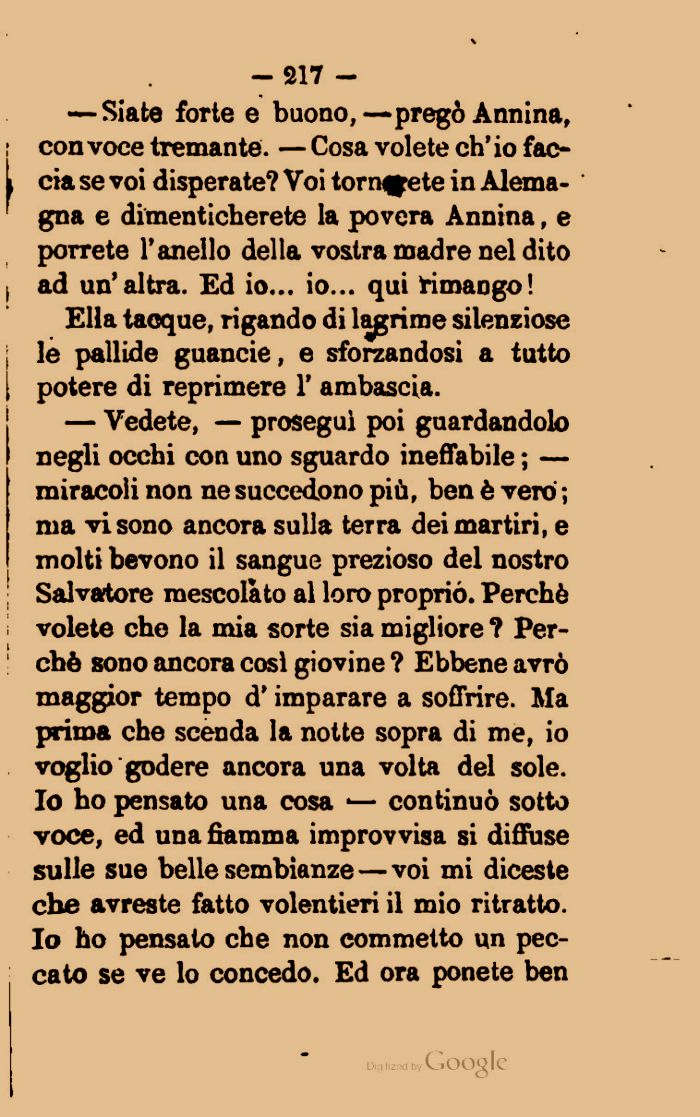 — Vedete, — prosegui poi guardandolo negli occhi con uno sguardo ineffabile ; — miracoli non ne succedono più, ben è vero ; ma vi sono ancora sulla terra dei martiri, e molti bevono il sangue prezioso del nostro Salvatore mescolato al loro proprio. Perchè volete che la mia sorte sia migliore ? Perchè sono ancora cosi giovine ? Ebbene avrò maggior tempo d'imparare a soffrire. Ma prima che scenda la notte sopra di me, io voglio godere ancora una volta del sole. Io ho pensato una cosa — continuò sotto voce, ed una fiamma improvvisa si diffuse sulle sue belle sembianze — voi mi diceste che avreste fatto volentieri il mio ritratto. Io ho pensalo che non commetto un peccato se ve lo concedo. Ed ora ponete ben