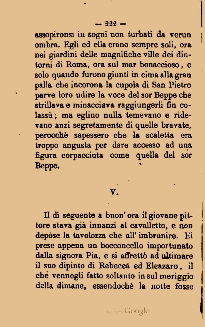Il dì seguente a buon' ora il giovane pit- ! tore stava già innanzi al cavalletto, e non depose la tavolozza che all' imbrunire. Ei prese appena un bocconcello importunato dalla signora Pia, e si affrettò ad ultimare il suo dipinto di Rebeccà ed Eleazaro, il ! che vennegli fatto soltanto in sul meriggio I della dimane, essendoché la notte fosse i