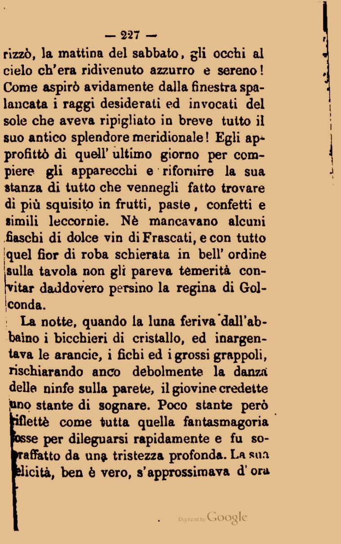 La notte, quando la luna feriva dall'abbaino i bicchieri di cristallo, ed inargentava le arancie, i fichi ed i grossi grappoli, rischiarando anco debolmente la danza delle ninfe sulla parete, il giovine credette pno stante di sognare. Poco stante però