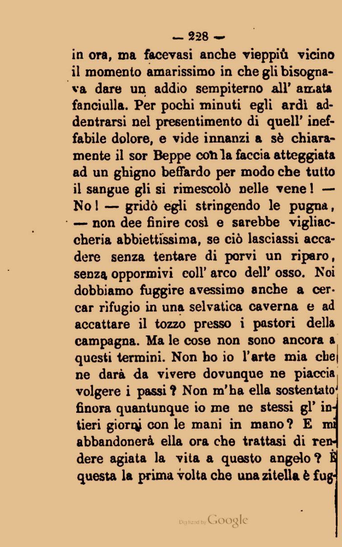 in ora, ma face vasi anche vieppiù vicino il momento amarissimo in che gli bisognava dare un addio sempiterno all' amata fanciulla. Per pochi minuti egli ardì addentrarsi nel presentimento di quell' ineffabile dolore, e vide innanzi a sè chiaramente il sor Beppe coli la faccia atteggiata ad un ghigno beffardo per modo che tutto il sangue gli si rimescolò nelle vene 1 — No 1 — gridò egli stringendo le pugna, — non dee finire così e sarebbe vigliaccheria abbiettissima, se ciò lasciassi accadere senza tentare di porvi un riparo, senza oppormivi coli' arco dell' osso. Noi dobbiamo fuggire avessimo anche a cercar rifugio in una selvatica caverna e ad accattare il tozzo presso i pastori della campagna. Ma le cose non sono ancora a questi termini. Non ho io l'arte mia elei ne darà da vivere dovunque ne piaccia volgere i passi ? Non m'ha ella sostentato' finora quantunque io me ne stessi gì' intieri giorni con le mani in mano? E mi abbandonerà ella ora che trattasi di rendere agiata la vita a questo angelo ? È questa la prima volta che una zitella è fug-