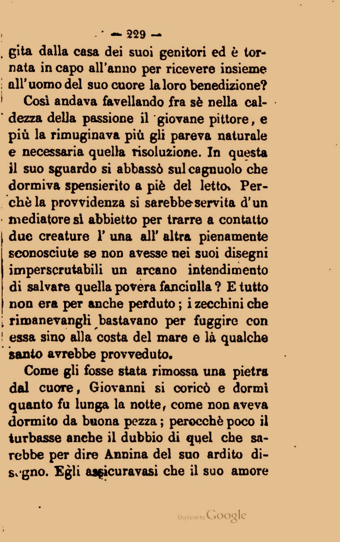gita dalla casa dei suoi genitori ed è tornata in capo all'anno per ricevere insieme all'uomo del suo cuore la loro benedizione? ' Cosi andava favellando fra sè nella caldezza della passione il giovane pittore, e più la rimuginava più gli pareva naturale e necessaria quella risoluzione. In questa il suo sguardo si abbassò sul cagnuolo che dormiva spensierito a piè del letto» Perchè la provvidenza si sarebbeservita d'un mediatore si abbietto per trarre a contatto due creature 1' una all' altra pienamente sconosciute se non avesse nei suoi disegni imperscrutabili un arcano intendimento di salvare quella povera fanciulla ? £ tutto non era per anche perduto ; i zecchini che , rimanevangli bastavano per fuggire con ! essa sino alla costa del mare e là qualche santo avrebbe provveduto.