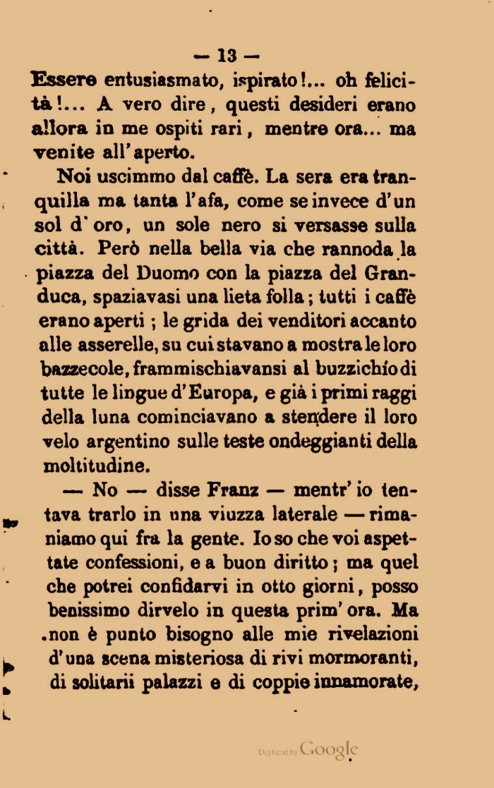 Noi uscimmo dal caffè. La sera era tranquilla ma tanta l'afa, come se invece d'un sol d'oro, un sole nero si versasse sulla città. Però nella bella via che rannoda la piazza del Duomo con la piazza del Granduca, spaziavasi una lieta folla ; tutti i caffè erano aperti ; le grida dei venditori accanto alle asserelle, su cui stavano a mostra le loro bazzecole,frammischiavansi al buzzichiodi tutte le lingue d'Europa, e già i primi raggi della luna cominciavano a stendere il loro velo argentino sulle teste ondeggianti della moltitudine.