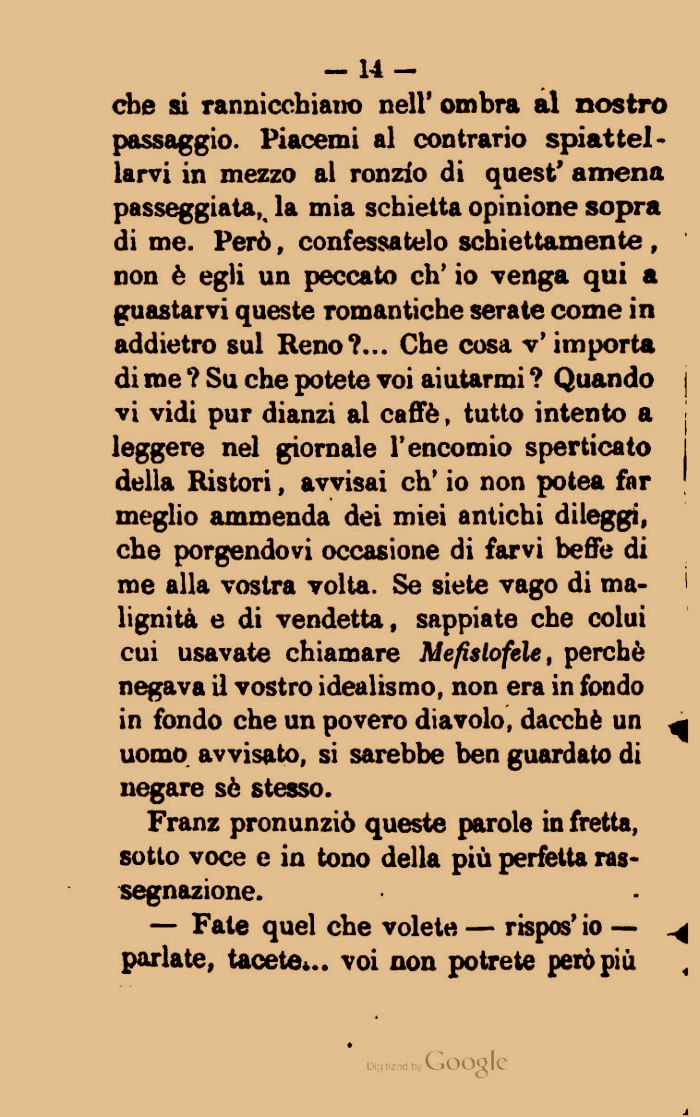 che si rannicchiano nell' ombra al nostro passaggio. Piacemi al contrario spiattellarvi in mezzo al ronzio di quest' amena passeggiata, la mia schietta opinione sopra di me. Però, confessatelo schiettamente , non è egli un peccato eh* io venga qui a guastarvi queste romantiche serate come in addietro sul Reno?... Che cosa v'importa di me ? Su che potete voi aiutarmi ? Quando vi vidi pur dianzi al caffè, tutto intento a leggere nel giornale l'encomio sperticato ! della Ristori, avvisai eh' io non potea far meglio ammenda dei miei antichi dileggi, che porgendovi occasione di farvi beffe di me alla vostra volta. Se siete vago di malignità e di vendetta, sappiate che colui cui usavate chiamare Me/ìstofcle, perchè negava il vostro idealismo, non era in fondo in fondo che un povero diavolo, dacché un ^ uomo avvisato, si sarebbe ben guardato di negare sè stesso.