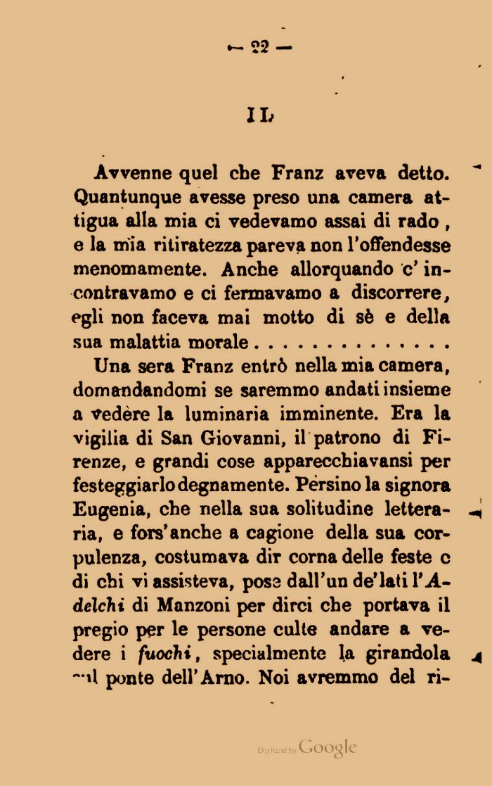 Una sera Franz entrò nella mia camera, domandandomi se saremmo andati insieme a vedere la luminaria imminente. Era la vigilia di San Giovanni, il patrono di Firenze, e grandi cose apparecchiavansi per festeggiarlo degnamente. Persino la signora Eugenia, che nella sua solitudine letteraria, e fors'anche a cagione della sua corpulenza, costumava dir corna delle feste c di chi vi assisteva, posa dall'un de'lati l'Adelchi di Manzoni per dirci che portava il pregio per le persone culle andare a vedere i fuochi, specialmente la girandola -'1 ponte dell'Arno. Noi avremmo del ri-