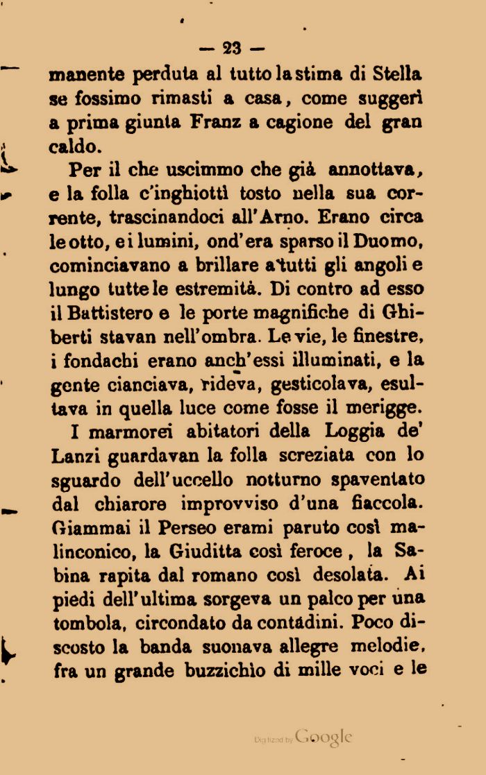 I marmorei abitatori della Loggia de' Lanzi guardavan la folla screziata con lo sguardo dell'uccello notturno spaventato dal chiarore improvviso d'una fiaccola. Giammai il Perseo erami paruto cosi malinconico, la Giuditta così feroce , la Sabina rapita dal romano così desolata. Ai piedi dell'ultima sorgeva un palco per una tombola, circondato da contadini. Poco discosto la banda suonava allegre melodie, fra un grande buzzichìo di mille voci e le