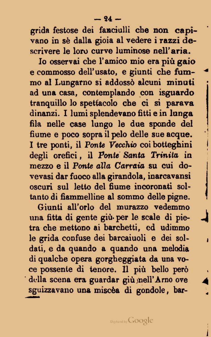 Giunti all'orlo del murazzo vedemmo ima fitta di gente giù- per le scale di pietra che mettono ai barchetti, ed udimmo le grida confuse dei barcaiuoli e dei soldati, e da quando a quando una melodia di qualche opera gorgheggiata da una voce possente di tenore. Il più bello però della scena era guardar giùjnell'Arno ove sguizzavano una miscèa di gondole, bar-