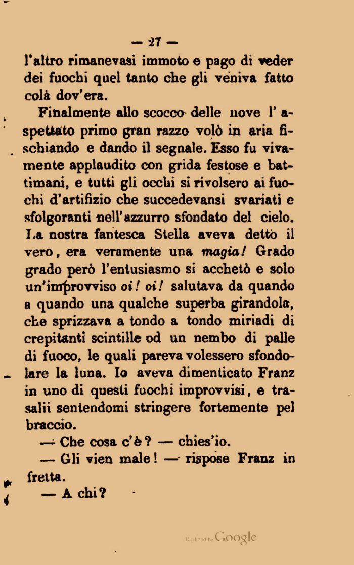 Finalmente allo scocco delle nove 1' a-spettato primo gran razzo volò in aria fischiando e dando il segnale. Esso fu vivamente applaudito con grida festose e battimani, e tutti gli occhi si rivolsero ai fuochi d'artifizio che suecedevansi svariati e sfolgoranti nell'azzurro sfondato del cielo. I.a nostra fantesca Stella aveva dettò il vero, era veramente una magia! Grado grado però l'entusiasmo si acchetò e solo un'improvviso oi! oi! salutava da quando a quando una qualche superba girandola, che sprizzava a tondo a tondo miriadi di crepitanti scintille od un nembo di palle di fuoco, le quali pareva volessero sfondo-lare la luna. Io aveva dimenticato Franz in uno di questi fuochi improvvisi, e trasalii sentendomi stringere fortemente pel braccio.