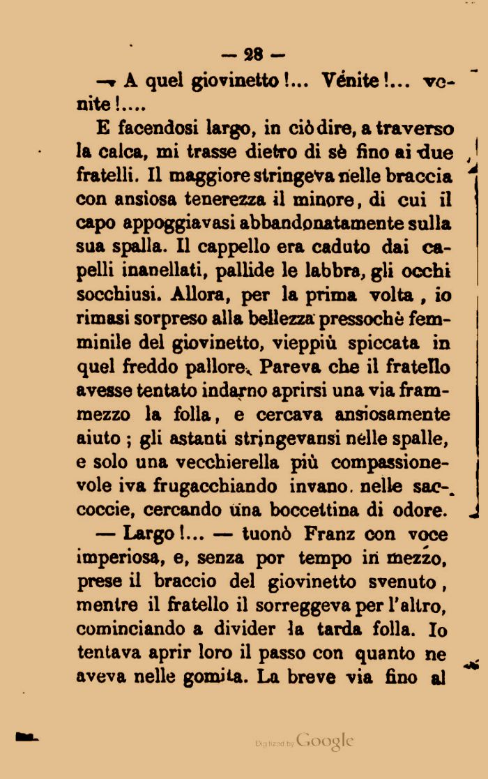 — Largo!... — tuonò Franz con voce imperiosa, e, senza por tempo in mezzo, prese il braccio del giovinetto svenuto , mentre il fratello il sorreggeva per l'altro, cominciando a divider la tarda folla. Io tentava aprir loro il passo con quanto ne aveva nelle gomita. La breve via fino al