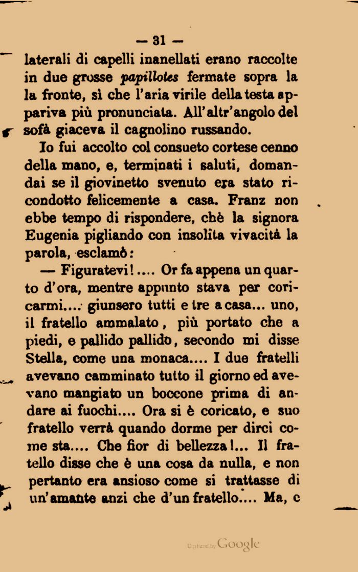 Io fui accolto col consueto cortese cenno della mano, e, terminati i saluti, domandai se il giovinetto svenuto era stato ricondotto felicemente a casa. Franz non ebbe tempo di rispondere, chè la signora Eugenia pigliando con insolita vivacità la parola, esclamò :