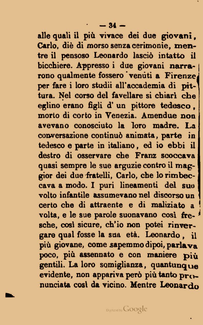alle quali il più vivace dei due giovani, Carlo, diè di morso senza cerimonie, mentre il pensoso Leonardo lasciò intatto il bicchiere. Appresso i due giovani narra- , rono qualmente fossero venuti a Firenze, per fare i loro studii all'accademia di pittura. Nel corso del favellare si chiari che eglino erano figli d' un pittore tedesco , morto di corto in Venezia. Amendue non avevano conosciuto la loro madre. La conversazione continuò animata, parte in tedesco e parte in italiano, ed io ebbi il destro di osservare che Franz scoccava quasi sempre le sue arguzie contro il maggior dei due fratelli, Carlo, che lo rimbeccava a modo. I puri lineamenti del suo volto infantile assumevano nel discorso un certo che di attraente e di maliziato a ¦ volta, e le sue parole suonavano cosi fre- 1 sche, così sicure, ch'io non potei rinver-gare qual fosse la sua età. Leonardo , il più giovane, come sapemmo dipoi, parlava