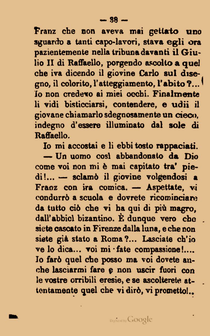 — Un uomo cosi abbandonalo da Dio come voi non mi è mai capitato tra' piedi!... — sclamò il giovine volgendosi a Franz con ira comica. — Aspettate, vi condurrò a scuola e dovrete ricominciare da tutto ciò che vi ha qui di più magro, dall'abbici bizantino. F. dunque vero che siete cascato in Firenze dalla luna, e che non siete già stato a Roma?... Lasciate ch'io ve lo dica... voi mi fate compassione!.... Io farò quel che posso ma voi dovete anche lasciarmi fare g non uscir fuori con le vostre orribili eresie, e se ascolterete attentamente quel che vi dirò, vi prometto!..