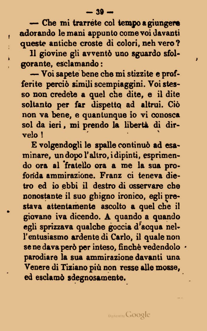 E volgendogli le spalle continuò ad esaminare, undopol'altro,idipinti, esprimendo ora al 'fratello ora a me la sua profonda ammirazione. Franz ci teneva dietro ed io ebbi il destro di osservare che nonostante il suo ghigno ironico, egli prestava attentamente ascolto a quel che il giovane iva dicendo. A quando a quando egli sprizzava qualche goccia d'acqua nell'entusiasmo ardente di Carlo, il quale non se ne dava però per inteso, finché vedendolo parodiare la sua ammirazione davanti una Venere di Tiziano più non resse alle mosse, ed esclamò sdegnosamente.