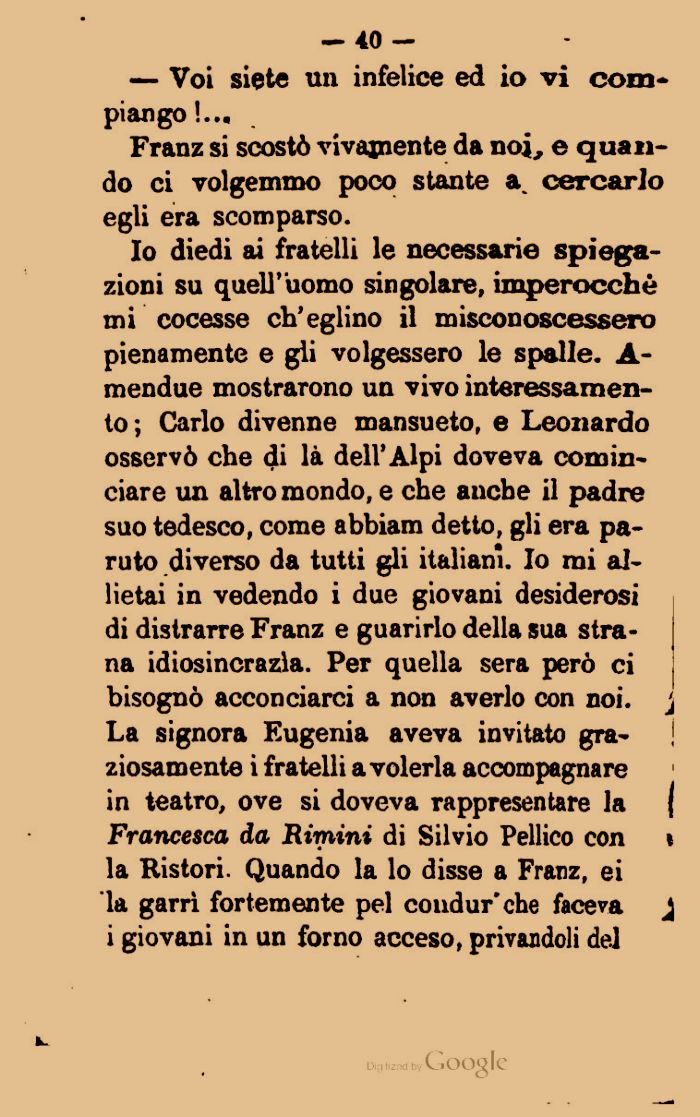 Io diedi ai fratelli le necessarie spiegazioni su quell'uomo singolare, imperocché mi cocesse ch'eglino il misconoscessero pienamente e gli volgessero le spalle. A-mendue mostrarono un vivo interessamento; Carlo divenne mansueto, e Leonardo osservò che di là dell'Alpi doveva cominciare un altro mondo, e che anche il padre suo tedesco, come abbiam detto, gli era pa-ruto diverso da tutti gli italiani. Io mi allietai in vedendo i due giovani desiderosi di distrarre Franz e guarirlo della sua strana idiosincrazìa. Per quella sera però ci bisognò acconciarci a non averlo con noi. La signora Eugenia aveva invitato graziosamente i fratelli a volerla accompagnare in teatro, ove si doveva rappresentare la Francesca da Rimini di Silvio Pellico con la Ristori. Quando la lo disse a Franz, ei la garrì fortemente pel condur'che faceva i giovani in un forno acceso, privandoli dei