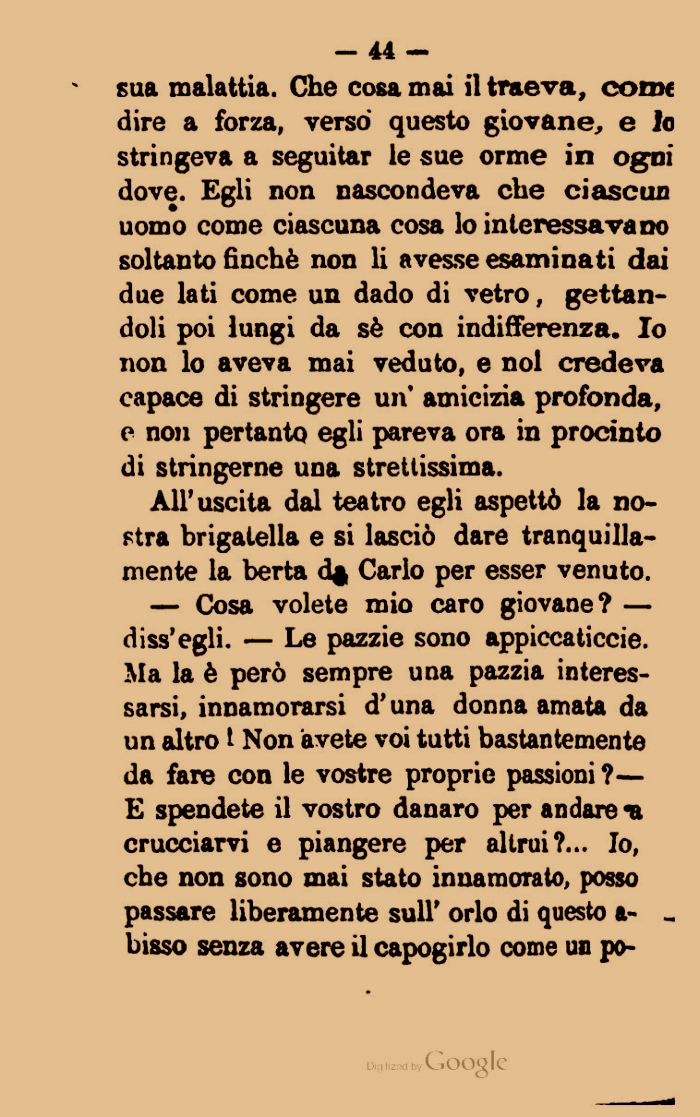 — Cosa volete mio caro giovane? — diss'egli. — Le pazzie sono appiccaticcie. Ma la è però sempre una pazzia interessarsi, innamorarsi d'una donna amata da un altro 1 Non avete voi tutti bastantemente da fare con le vostre proprie passioni ?— E spendete il vostro danaro per andare ti crucciarvi e piangere per altrui?... Io, che non sono mai stato innamorato, posso passare liberamente sull' orlo di questo a- _ bisso senza avere il capogirlo come un po-