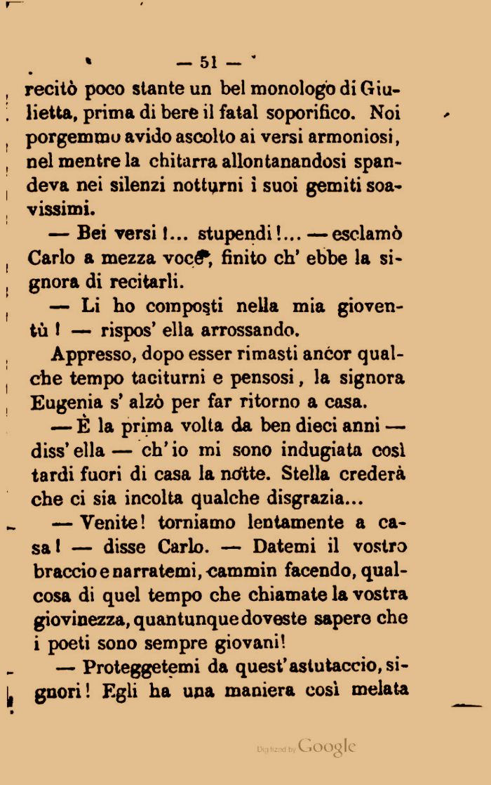 recitò poco stante un bel monologo di Giulietta, prima di bere il fatai soporifico. Noi porgemmo avido ascolto ai versi armoniosi, nel mentre la chitarra allontanandosi spandeva nei silenzi notturni i suoi gemiti soavissimi.