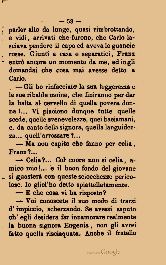 —¦ Celia?... Col cuore non si celia, a-mico mio!... è il buon fondo del giovane _ si guasterà con queste sciocchezze pericolose. Io gliel'ho detto spiattellatamente.