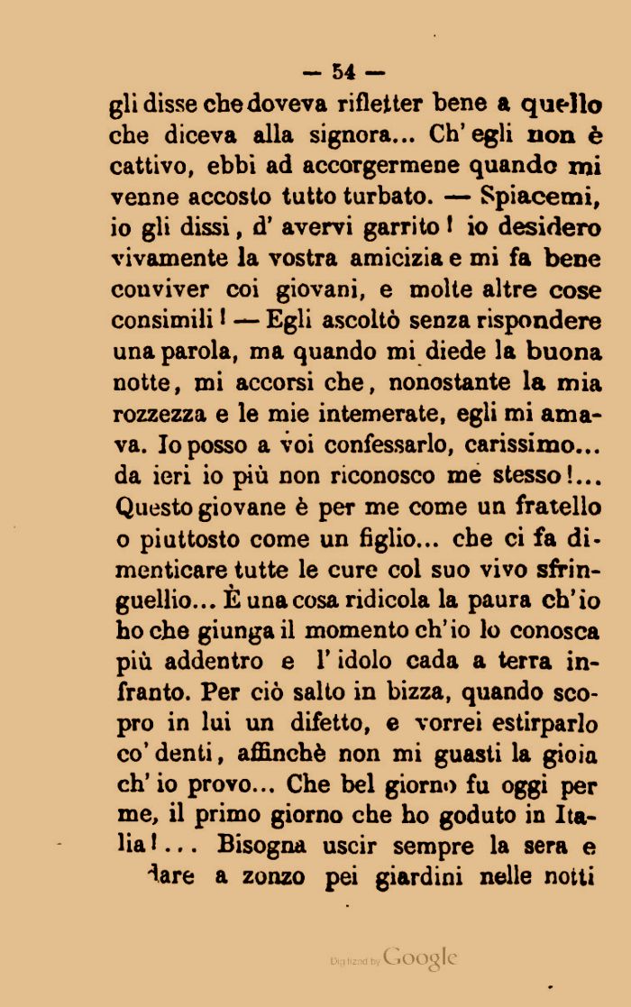 gli disse che doveva rifletter bene a quc-llo che diceva alla signora... Ch'egli non è cattivo, ebbi ad accorgermene quando mi venne accosto tutto turbato. — Spiacemi, io gli dissi, d' avervi garrito I io desidero vivamente la vostra amicizia e mi fa bene conviver coi giovani, e molte altre cose consimili I — Egli ascoltò senza rispondere una parola, ma quando mi diede la buona notte, mi accorsi che, nonostante la mia rozzezza e le mie intemerate, egli mi amava. Io posso a voi confessarlo, carissimo... da ieri io più non riconosco me stesso!... Questo giovane è per me come un fratello o piuttosto come un figlio... che ci fa dimenticare tutte le cure col suo vivo sfrin-guellio... È una cosa ridicola la paura ch'io ho che giunga il momento ch'io lo conosca più addentro e l'idolo cada a terra infranto. Per ciò salto in bizza, quando scopro in lui un difetto, e vorrei estirparlo co' denti, affinchè non mi guasti la gioia eh' io provo... Che bel giorno fu oggi per me, il primo giorno che ho goduto in Italia I... Bisogna uscir sempre la sera e lare a zonzo pei giardini nelle notti