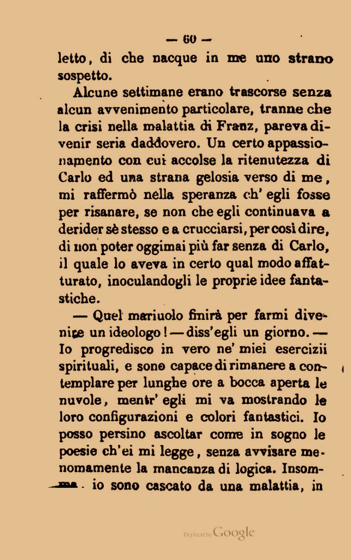 — Quel moriuolo finirà per farmi divenite un ideologo! — diss'egli un giorno.— Io progredisco in vero ne' miei esercizii spirituali, e sono capace di rimanere a con- i templare per lunghe ore a bocca aperta le nuvole, mentr' egli mi va mostrando le loro configurazioni e colori fantastici. Io posso persino ascoltar come in sogno le poesie ch'ei mi legge, senza avvisare menomamente la mancanza di logica. Insom-io sono cascato da una malattia, in