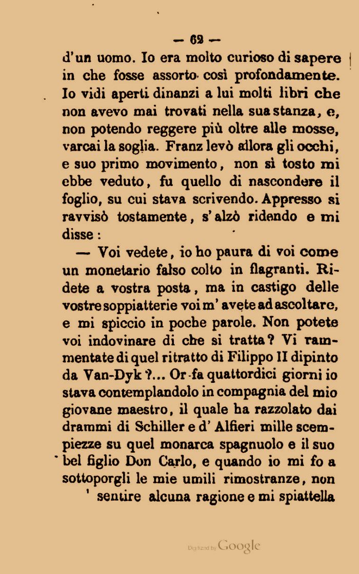 — Voi vedete, io ho paura di voi come un monetario falso colto in flagranti. Ridete a vostra posta, ma in castigo delle vostre soppiatterie voim' avete ad ascoltare, e mi spiccio in poche parole. Non potete voi indovinare di che si tratta? Vi rammentate di quel ritratto di Filippo lì dipinto da Van-Dvk?... Or fa quattordici giorni io stava contemplandolo in compagnia del mio giovane maestro, il quale ha razzolato dai drammi di Schiller e d' Alfieri mille scena-piezze su quel monarca spagnuolo e il suo bel figlio Don Carlo, e quando io mi fo a sottoporgli le mie umili rimostranze, non sentire alcuna ragione e mi spiattella