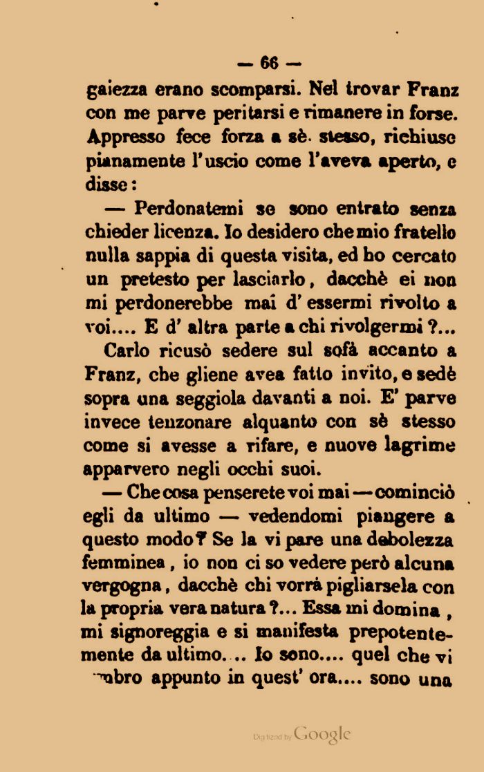 Carlo ricusò sedere sul sofà accanto a Franz, che gliene avea fatto invito, e sedè sopra una seggiola davanti a noi. E* parve invece tenzonare alquanto con sè stesso come si avesse a rifare, e nuove lagrime apparvero negli occhi suoi.