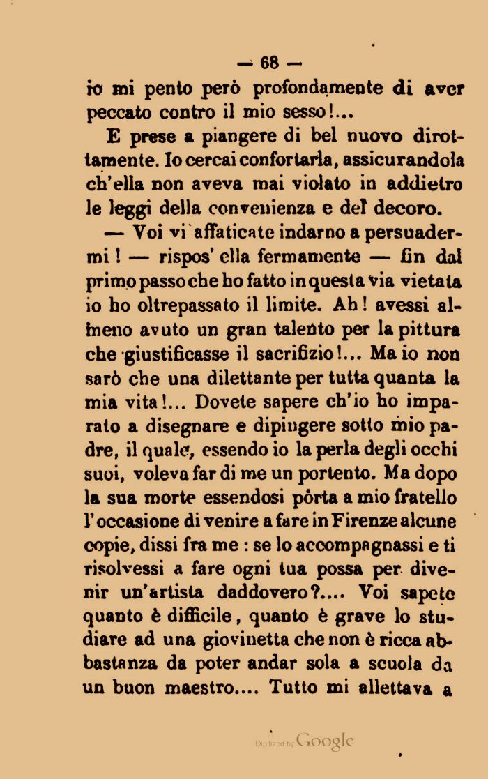 — Voi vi affaticate indarno a persuadermi ! — rispos' ella fermamente — fin dal primo passo che ho fatto in questa via vietala io ho oltrepassato il limite. Ah! avessi almeno av uto un gran talento per la pittura che giustificasse il sacrifizio!... Maio non sarò che una dilettante per tutta quanta la mia vita!... Dovete sapere ch'io ho imparalo a disegnare e dipingere sotto mio padre, il quale, essendo io la perla degli occhi suoi, voleva far di me un portento. Ma dopo la sua morte essendosi pòrta a mio fratello l'occasione di venire afare inFirenzealcune copie, dissi fra me : se lo accompagnassi e ti risolvessi a fare ogni tua possa per divenir un'artista daddovero?.... Voi sapete quanto è difficile, quanto è grave lo studiare ad una giovinetta che non è ricca abbastanza da poter andar sola a scuola da un buon maestro.... Tutto mi allettava a