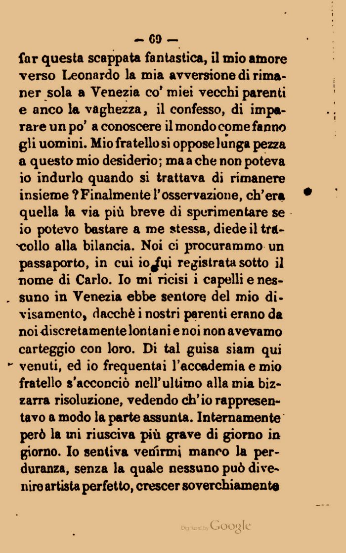far questa scappata fantastica, il mio amore verso Leonardo la mia avversione di rimaner sola a Venezia co' miei vecchi parenti e anco la vaghezza, il confesso, di imparare un po' a conoscere il mondo come fanno gli uomini. Miofratellosi oppose lunga pezza a questo mio desiderio; ma a che non poteva io indurlo quando si trattava di rimanere insieme ?Finalmente l'osservazione, ch'era quella la via più breve di sperimentare se io potevo bastare a me stessa, diede il tm-¦collo alla bilancia. Noi ci procurammo un passaporto, in cui iojui registrata sotto il nome di Carlo. Io mi ricisi i capelli e nes-. suno in Venezia ebbe sentore del mio divisamente, dacché i nostri parenti erano da noidiscretamentelontanienoi non avevamo carteggio con loro. Di tal guisa siam qui - venuti, ed io frequentai l'accademia e mio fratello s'acconciò nell'ultimo alla mia bizzarra risoluzione, vedendo eh' io rappresentavo a modo la parte assunta. Internamente però la mi riusciva più grave di giorno in giorno. Io sentiva venirmi manco la perdurala, senza la quale nessuno può divenire artista perfetto, crescer soverchiamente