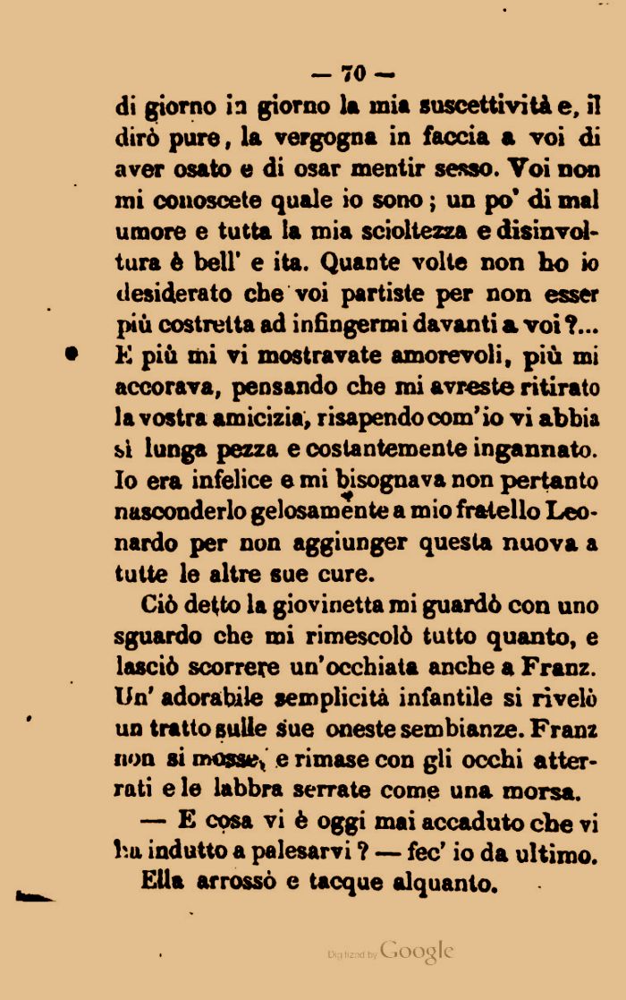 • E più mi vi mostravate amorevoli, più mi accorava, pensando che mi avreste ritirato la vostra amicizia, risapendo com'io vi abbia si lunga pezza e costantemente ingannato. Io era infelice e mi bisognava non pertanto nasconderlo gelosamente a mio fratello Leonardo per non aggiunger questa nuova a tutte le altre sue cure.
