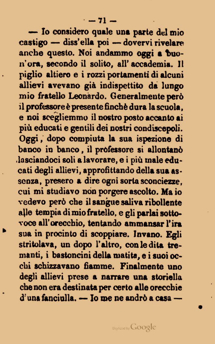 — Io considero quale una parte del mio castigo — diss'ella poi — dovervi rivelare anche questo. Noi andammo oggi a buon'ora, secondo il solito, all' accademia. Il piglio altiero e i rozzi portamenti di alcuni allievi avevano già indispettito da lungo mio fratello Leonardo. Generalmente però il professore è presente finché dura la scuola, e noi scegliemmo il nostro posto accanto ai più educati e gentili dei nostri condiscepoli. Oggi, dopo compiuta la sua ispezione di banco in banco, il professore si allontanò lasciandoci soli a lavorare, e i più male educati degli allievi, approfittando della sua assenza, presero a dire ogni sorta sconciezze, cui mi studiavo non porgere ascolto. Maio vedevo però che il sangue saliva ribollente a)le tempia di mio fratello, e gli parlai sottovoce all'orecchio, tentando ammansar l'ira sua in procinto di scoppiare. Invano. Egli stritolava, un dopo l'altro, con le dita tremanti, i bastoncini della matita, e i suoi occhi schizzavano fiamme. Finalmente uno degli allievi prese a narrare una storiella che non era destinata per certo alle orecchie d'una fanciulla. — Io me ne andrò a casa —