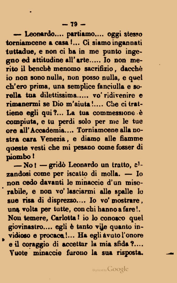 — Leonardo.... partiamo.... oggi stesso torniamcene a casa I... Ci siamo ingannati tuttadue, e non ci ha in me punto ingegno ed attitudine all'arte.....Io non merito il benché menomo sacrifizio, dacché io non sono nulla, non posso nulla, e quel ch'ero prima, una semplice fanciulla e sorella tua dilettissima..... vo' ridivenire c