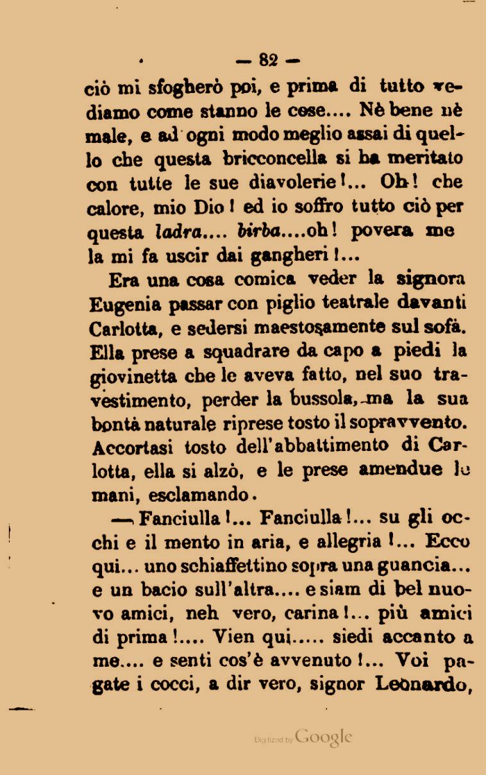 Era una cosa comica veder la signora Eugenia passar con piglio teatrale davanti Carlotta, e sedersi maestosamente sul sofà. Ella prese a squadrare da capo a piedi la giovinetta che le aveva fatto, nel suo travestimento, perder la bussola, -ma la sua bontà naturale riprese tosto il sopravvento. Accortasi tosto dell'abbattimento di Carlotta, ella si alzò, e le prese amendue le mani, esclamando.