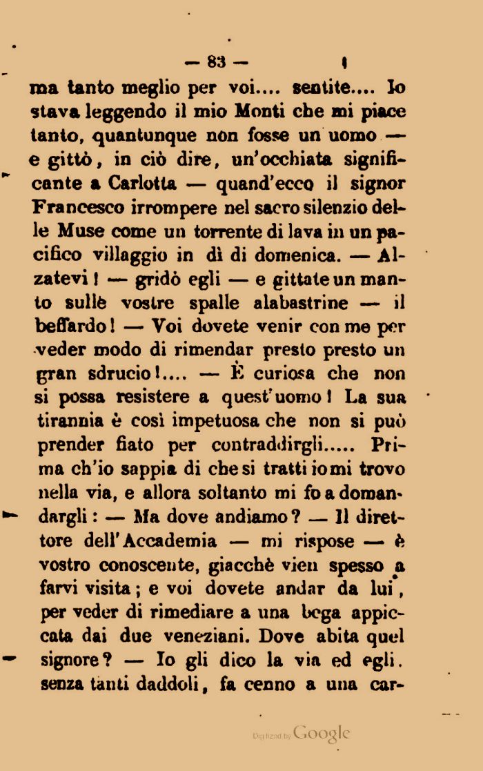 — 83 — t ma tanto meglio per voi.... sentite.... Io stava leggendo il mio Monti che mi piace tanto, quantunque non fosse un uomo — e gittò, in ciò dire, un'occhiata significante a Carlotta — quand'ecco il signor Francesco irrompere nel sacro silenzio delle Muse come un torrente di lava in un pacifico villaggio in dì di domenica. — Alzatevi , •— gridò egli — e gittate un manto sullfe vostre spalle alabastrine — il beffardo ! — Voi dovete venir con me per veder modo di rimendar presto presto un gran sdrucio 1.... — E curiosa che non si possa resistere a quest'uomo 1 La sua tirannia è così impetuosa che non si può prender fiato per contraddirgli..... Prima ch'io sappia di obesi trattiiomi trovo nella via, e allora soltanto mi fo a domandargli : — Ma dove andiamo ? — 11 direttore dell'Accademia — mi rispose — è vostro conoscente, giacché vien spesso a farvi visita ; e voi dovete andar da lui, per veder di rimediare a una boga appiccata dai due veneziani. Dove abita quel signore? — Io gli dico la via ed egli, senza tanti daddoli, fa cenno a una car- ![]() |
