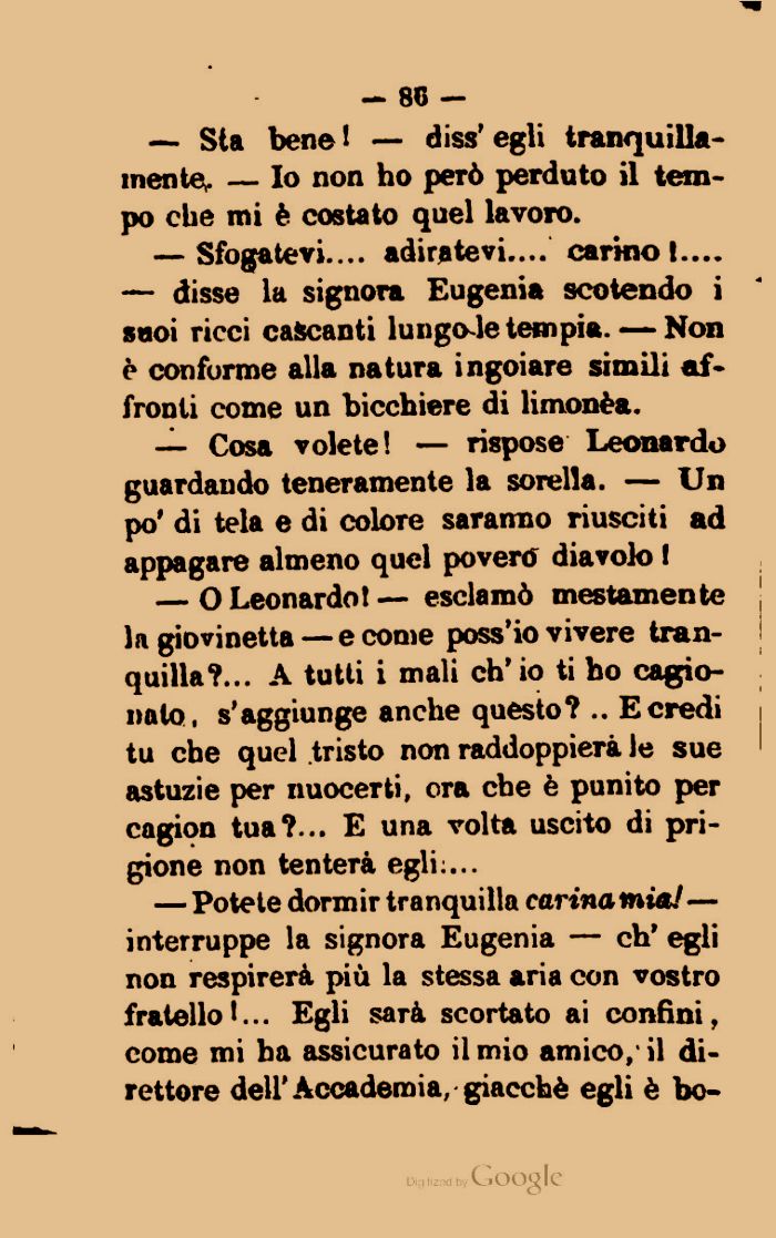 — O Leonardo!— esclamò mestamente la giovinetta — e come poss'io vivere tranquilla?... A tutti i mali ch'io ti ho cagionalo, s'aggiunge anche questo? .. E credi tu che quel tristo non raddoppierà le sue astuzie per nuocerti, ora che è punito per cagion tua?... E una volta uscito di prigione non tenterà egli:...