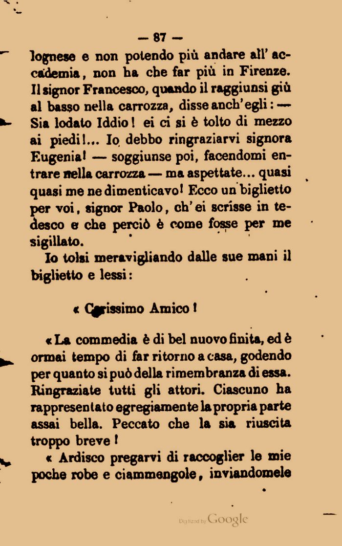lognese e non polendo più andare all' accademia , non ha che far più in Firenze. Il signor Francesco, quando il raggiunsi giù al basso nella carrozza, disse anch'egli: — Sia lodalo Iddio ! ei ci si è tolto di mezzo ai piedi 1... Io debbo ringraziarvi signora Eugenia' — soggiunse poi, facendomi entrare nella carrozza — ma aspettate... quasi quasi me ne dimenticavo! Ecco un biglietto per voi, signor Paolo, eh' ei scrisse in tedesco e che perciò è come fosse per me sigillato.