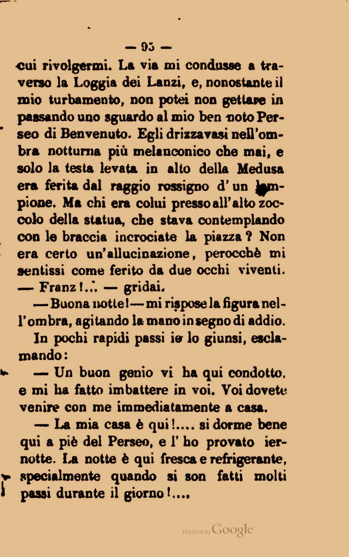 -cui rivolgermi. La via mi condusse a traverso la Loggia dei Lanzi, e, nonostante il mio turbamento, non potei non gettare in passando uno sguardo al mio ben noto Perseo di Benvenuto. Egli drizzava» nell'ombra notturna più melanconico che mai, e solo la testa levata in alto della Medusa era ferita dal raggio rossigno d' un lampione. Ma chi era colui presso all'alto zoccolo della statua, che stava contemplando con le braccia incrociate la piazza ? Non era certo un'allucinazione, perocché mi sentissi come ferito da due occhi viventi. — Franz !..'. — gridai.