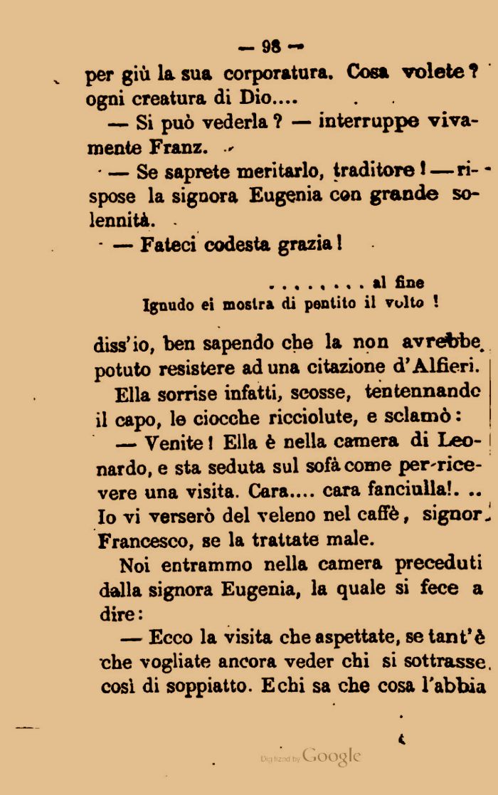 — Venite ! Ella è nella camera di Leonardo, e sta seduta sul sofà come per-rice-vere una visita. Cara.... cara fanciulla!. .. Io vi verserò del veleno nel caffè, signorJ Francesco, se la trattate male.