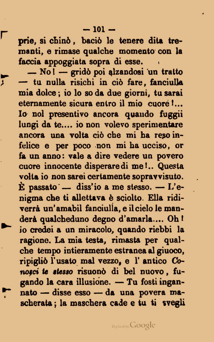 — No I — gridò poi alzandosi un tratto — tu nulla risichi in ciò fare, fanciulla mia dolce -, io lo so da due giorni, tu sarai eternamente sicura entro il mio cuore'... Io noi presentivo ancora quando fuggii lungi da te.... io non volevo sperimentare ancora una volta ciò che mi ha reso infelice e per poco non mi ha ucciso, or fa un anno : vale a dire vedere un povero cuore innocente disperare di me'.. Questa volta io non sarei certamente sopravvisuto. È passato — diss'io a me stesso. — L'enigma che ti allettava è sciolto. Ella ridiverrà un'amabil fanciulla, e il cielo le manderà qualcheduno degno d'amarla.... Oh I io credei a un miracolo, quando riebbi la ragione. La mia testa, rimasta per qualche tempo intieramente estranea al giuoco, ripigliò l'usato mal vezzo, e 1' antico Conosci te stesso risuonò dì bel nuovo, fugando la cara illusione. — Tu fosti ingannato — disse esso — da una povera mascherata ; la maschera cade e tu ti svegli