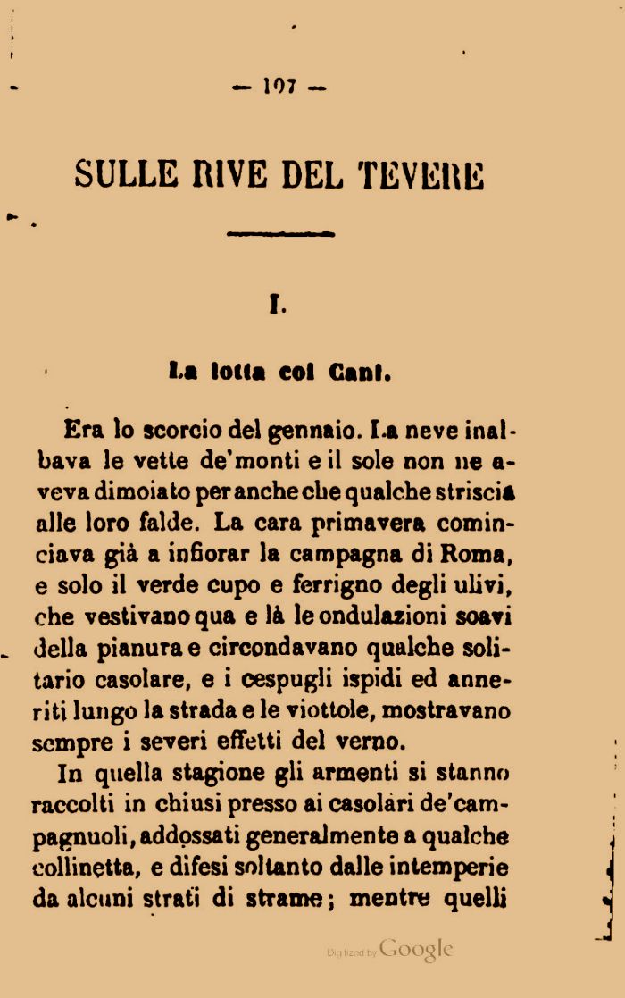 Era lo scorcio del gennaio. la neve inalbava le vette de'monti e il sole non ne a-veva dimoiato per anchecbe qualche striscia alle loro falde. La cara primavera cominciava già a infiorar la campagna di Roma, e solo il verde cupo e ferrigno degli ulivi, che vestivano qua e là le ondulazioni soavi della pianura e circondavano qualche solitario casolare, e i cespugli ispidi ed anneriti lungo la strada e le viottole, mostravano sempre i severi effetti del verno.