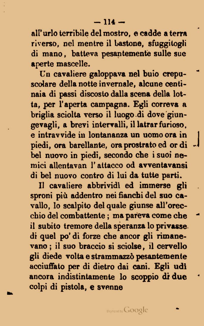 Un cavaliere galoppava nel buio crepuscolare della notte invernale, alcune centinaia di passi discosto dalla scena della lotta, per l'aperta campagna. Egli correva a briglia sciolta verso il luogo di dove giun-gevagli, a brevi intervalli, il latrar furioso, e intravvide in lontananza un uomo ora in piedi, ora barellante, ora prostrato ed or di bel nuovo in piedi, secondo che i suoi nemici allentavan l'attacco od avventavansi di bel nuovo contro di lui da tutte parti.