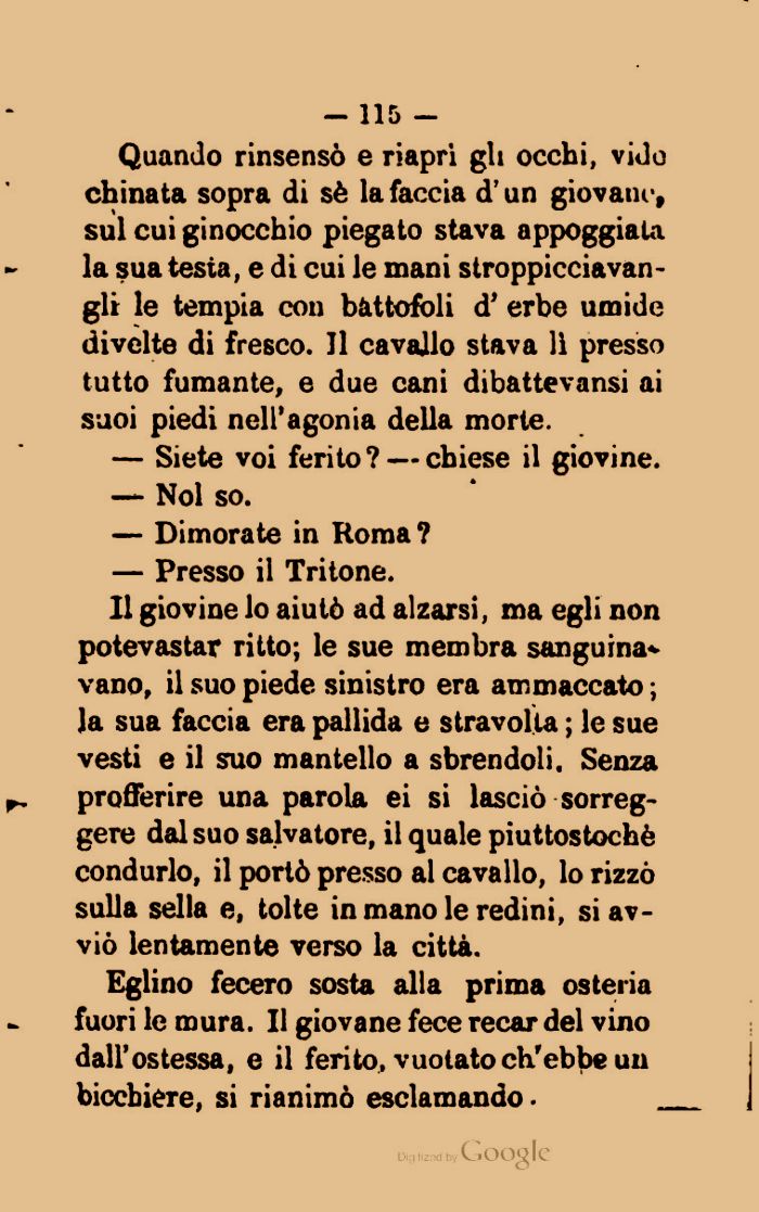 Il giovine lo aiutò ad alzarsi, ma egli non potevastar ritto; le sue membra sanguina* vano, il suo piede sinistro era ammaccato ; la sua faccia era pallida e stravolta ; le sue vesti e il suo mantello a sbrendoli. Senza profferire una parola ei si lasciò sorreggere dal suo salvatore, il quale piuttostochè condurlo, il portò presso al cavallo, lo rizzò sulla sella e, tolte in mano le redini, si avviò lentamente verso la città.
