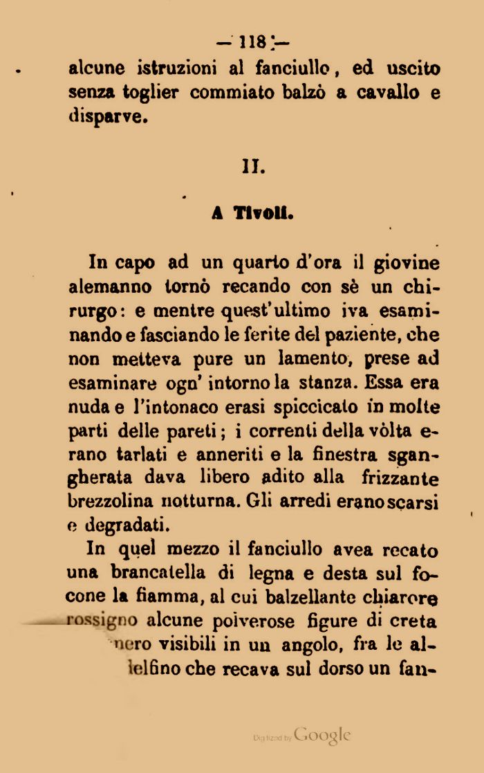 In capo ad un quarto d'ora il giovine alemanno tornò recando con sè un chirurgo: e mentre quest'ultimo iva esaminando e fasciando le ferite del paziente, che non meiteva pure un lamento, prese ad esaminare ogn' intorno la stanza. Essa era nuda e l'intonaco erasi spiccicato in molte parti delle pareti ; i correnti della vòlta e-rano tarlati e anneriti e la finestra sgangherata dava libero adito alla frizzante brezzolina notturna. Gli arredi eranoscarsi e degradati.