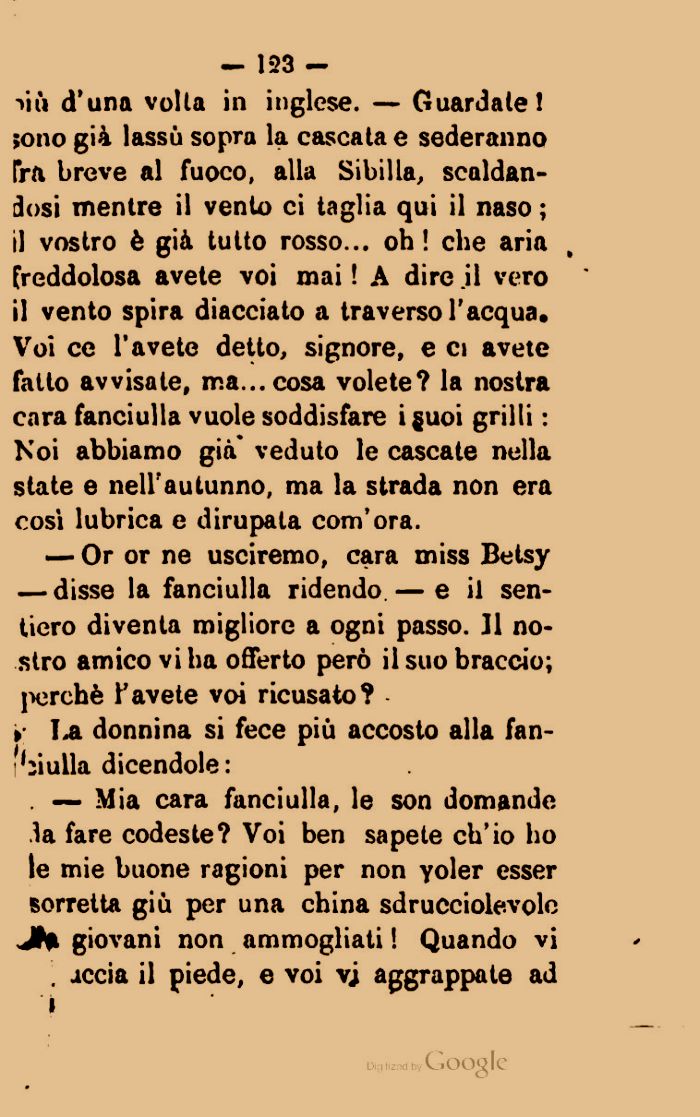 Viù d'una volta in inglese. — Guardate! ;ono già lassù sopra la cascata e sederanno Ira breve al fuoco, alla Sibilla, scaldandosi mentre il vento ci taglia qui il naso ; il vostro è già tutto rosso... oh! che aria freddolosa avete voi mai ! A dire il vero il vento spira diacciato a traverso l'acqua. Voi ce l'avete detto, signore, e ci avete fatto avvisate, ma... cosa volete? la nostra cara fanciulla vuole soddisfare i guoi grilli : Noi abbiamo già veduto le cascate nella state e nell'autunno, ma la strada non era cosi lubrica e dirupata com'ora.