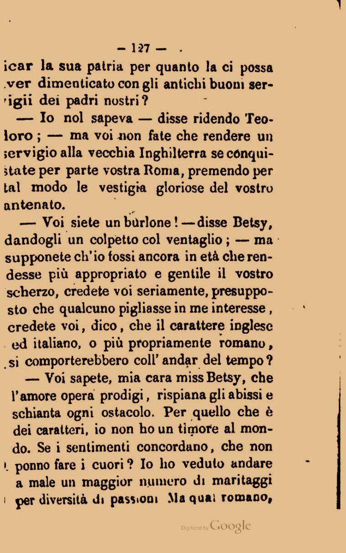 — Voi siete un burlone!—disse Betsy, dandogli un colpetto col ventaglio ; — ma supponete eh' io tossi ancora in età che rendesse più appropriato e gentile il vostro scherzo, credete voi seriamente, presupposto che qualcuno pigliasse in me interesse , credete voi, dico , che il carattere inglese ed italiano, o più propriamente romano, si comporterebbero coli'andar del tempo?