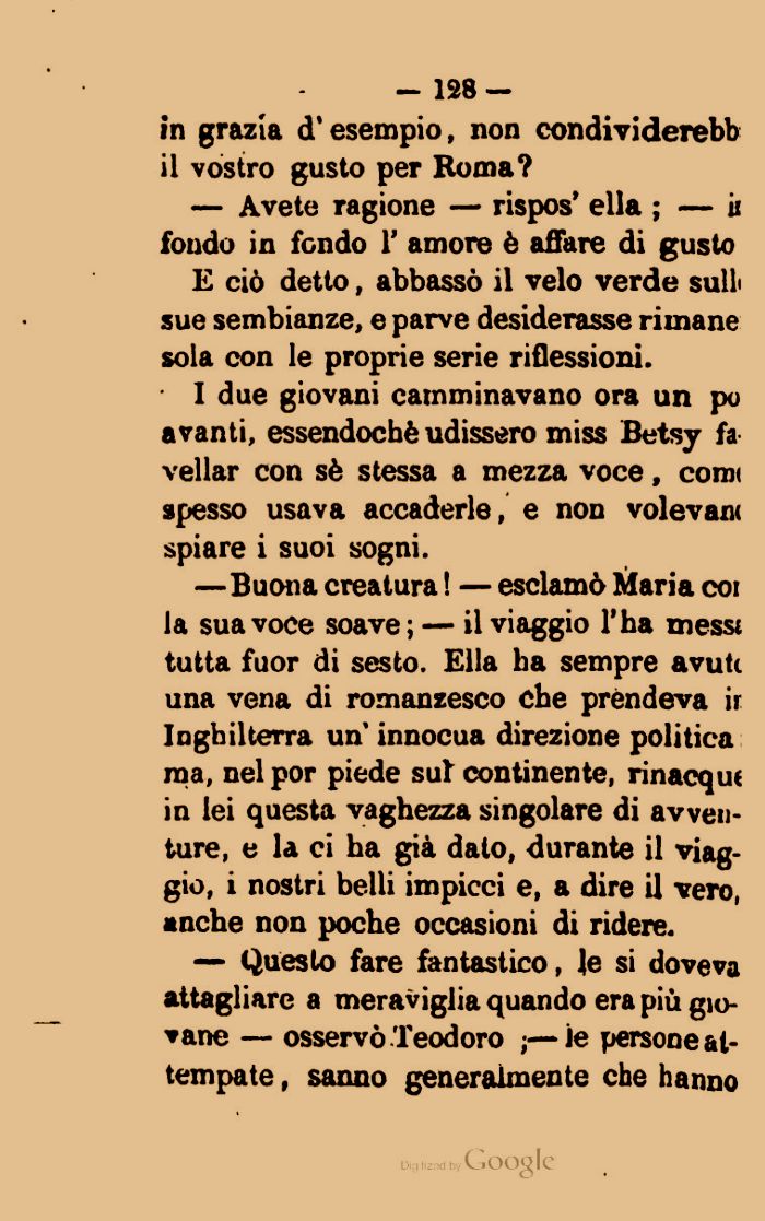 —Buona creatura ! — esclamò Maria coi la sua voce soave ; — il viaggio l'ha messi tutta fuor di sesto. Ella ha sempre avuti una vena di romanzesco che prèndeva ir Inghilterra un innocua direzione politica ma, nel por piede sul continente, rinacque in lei questa vaghezza singolare di avventure, e la ci ha già dato, durante il viaggio, i nostri belli impicci e, a dire il vero, anche non poche occasioni di ridere.