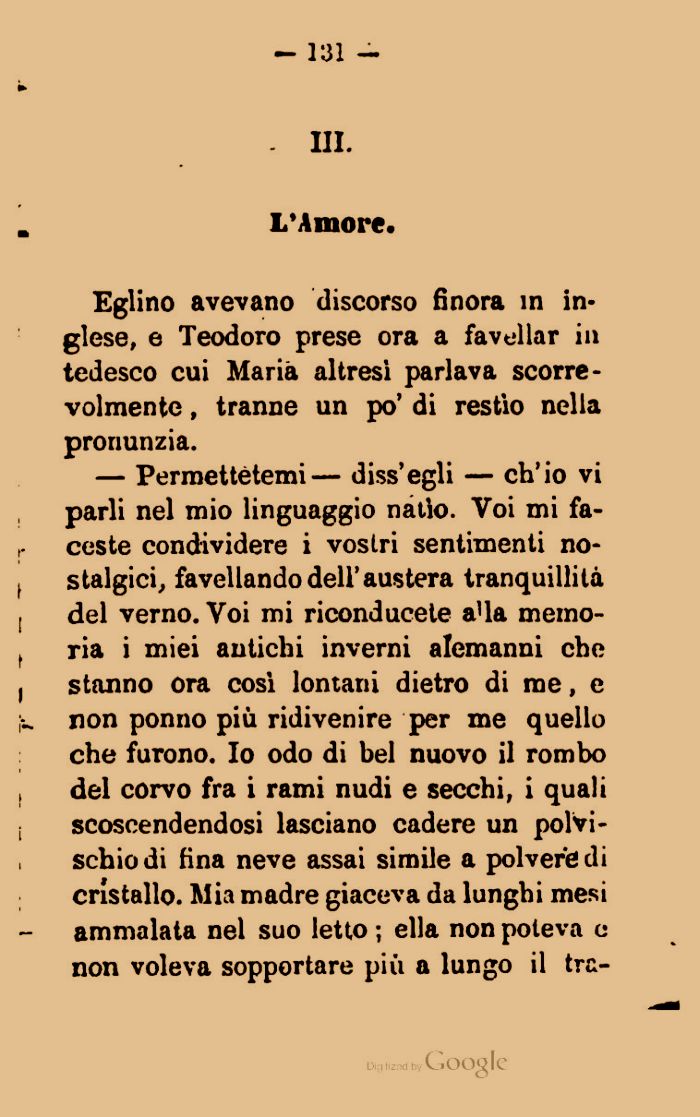Eglino avevano discorso finora in inglese, e Teodoro prese ora a favellar in tedesco cui Maria altresì parlava scorrevolmente , tranne un po' di restio nella pronunzia.